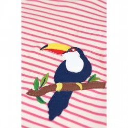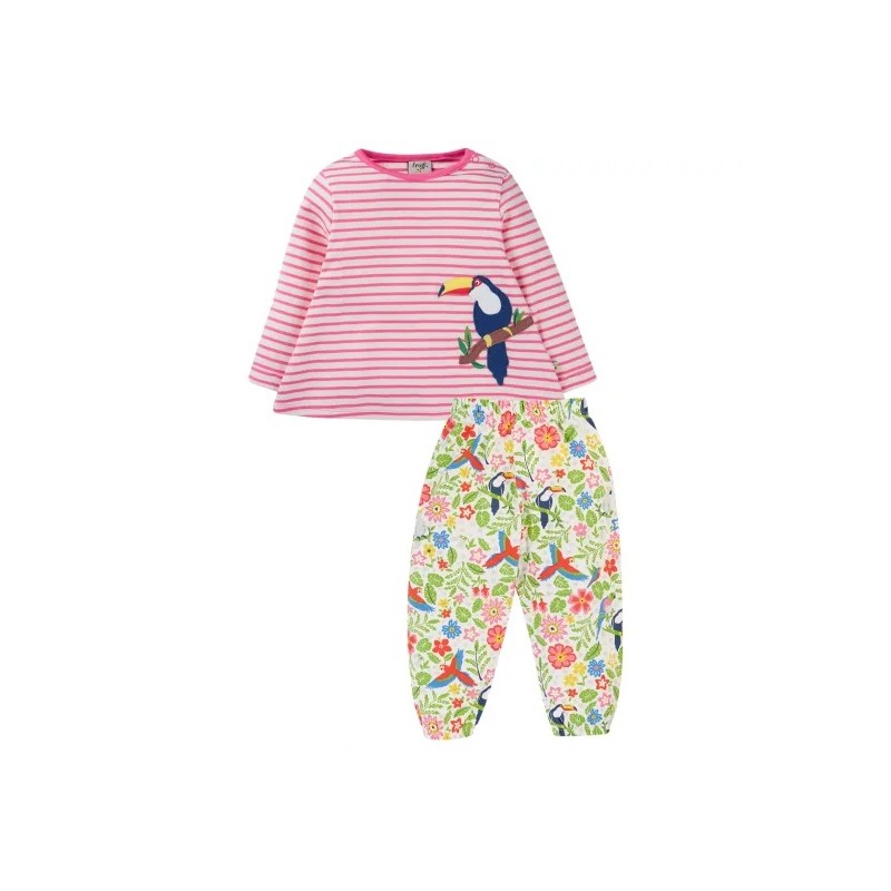 This 2 piece outfit includes a long sleeved a line top with popper fastening at the shoulder with an embroidered toucan on the front. Co-ordinating leggings in a delightful tropical pattern which includes parrots, flowers toucans etc.