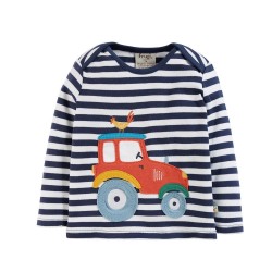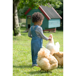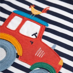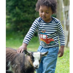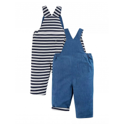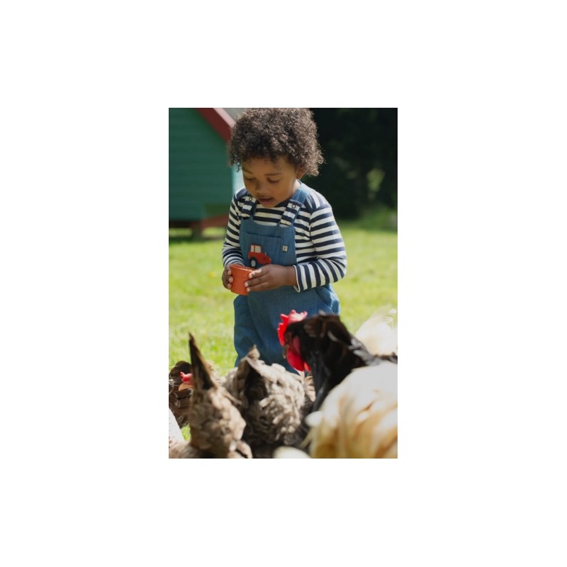 Frugi set made from super soft Organic cotton These Sonny reversible dungarees in Indigo stripe are crafted from 100% organic cotton with is super soft and hardwearing and gentle against the skin. The adjustable popper fastening shoulder straps allow these dungarees to grown with your little one. Teamed with the matching Bobby top with envelope neckline and applique tractor top - a perfect co-ordinated outfit.